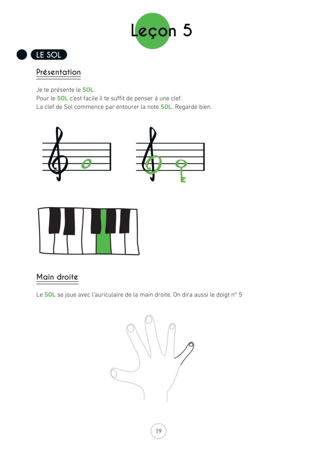 À travers 35 pages découpées en 7 leçons ludiques, l’élève découvre les 8 premières notes de la clé de Sol grâce à des jeux, des morceaux et des activités qui rendent l’apprentissage naturel et joyeux.